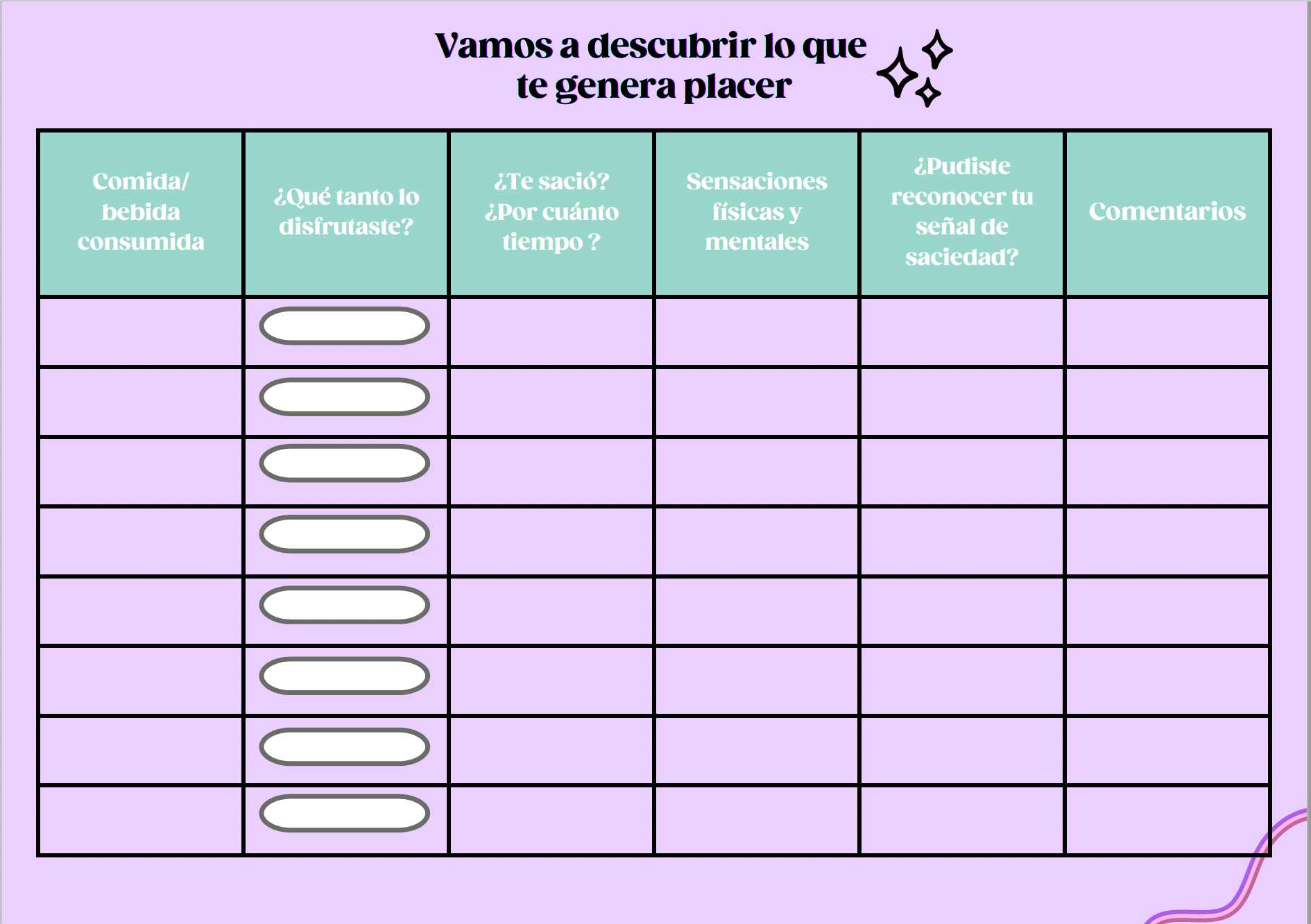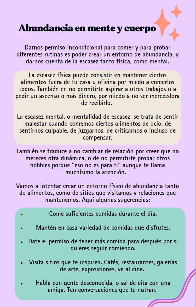 En esta parte pasamos por gratitud corporal, respeto al cuerpo y reglas alimentarias.